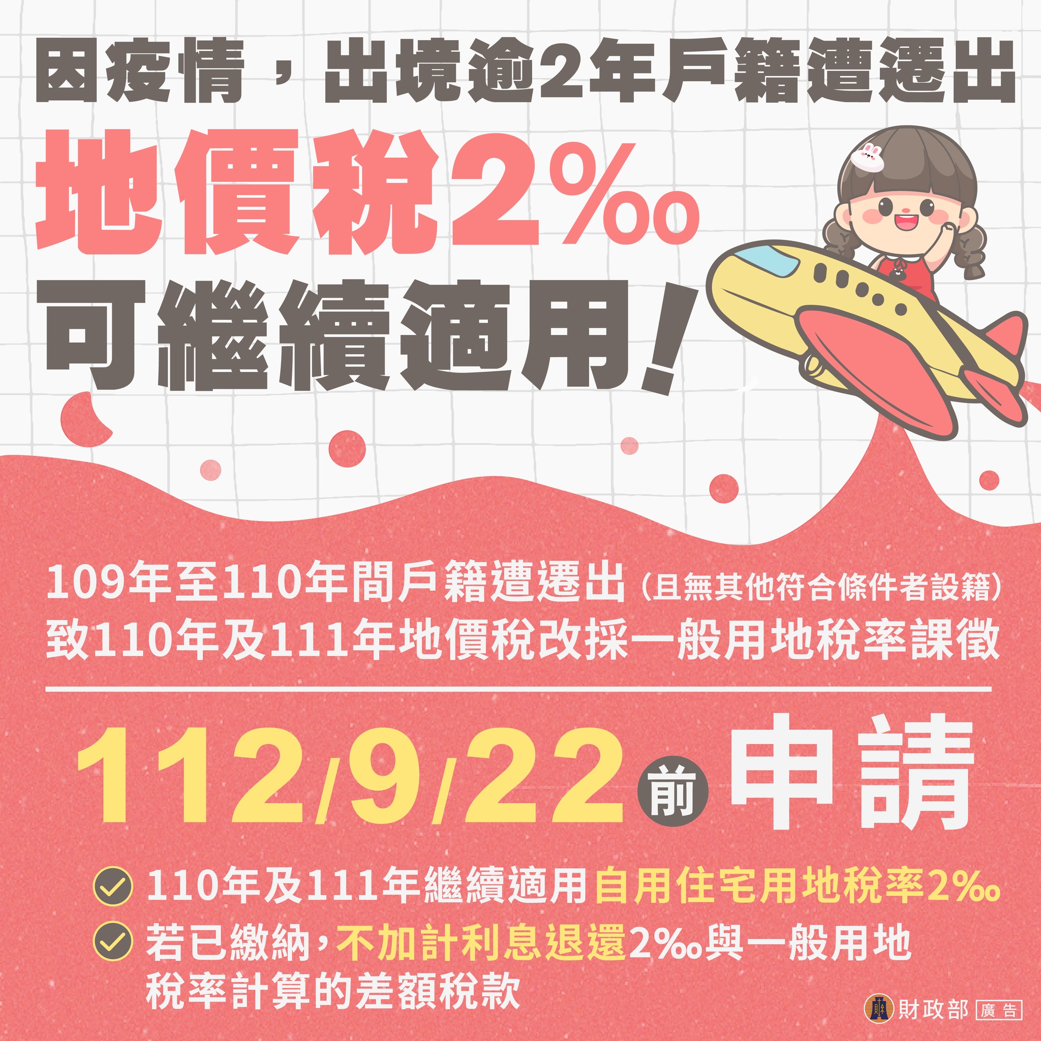 財政部近期發布函釋說明,如果原本的土地有適用地價稅自用住宅用地的稅率,卻在 2020 − 2021年因疫情影響而無法返國申請優惠稅率者,或者戶籍遭強制遷出以致土地不符設籍要件,而被迫改為一般用地稅率課徵,設籍人可以在 2023 年 9 月 22 日前逕向土地所在地的稽徵機關檢附相關文件提出申請,經審核認準後 2021 年及 2022 年的地價稅仍可以享有 2‰的優惠稅率。