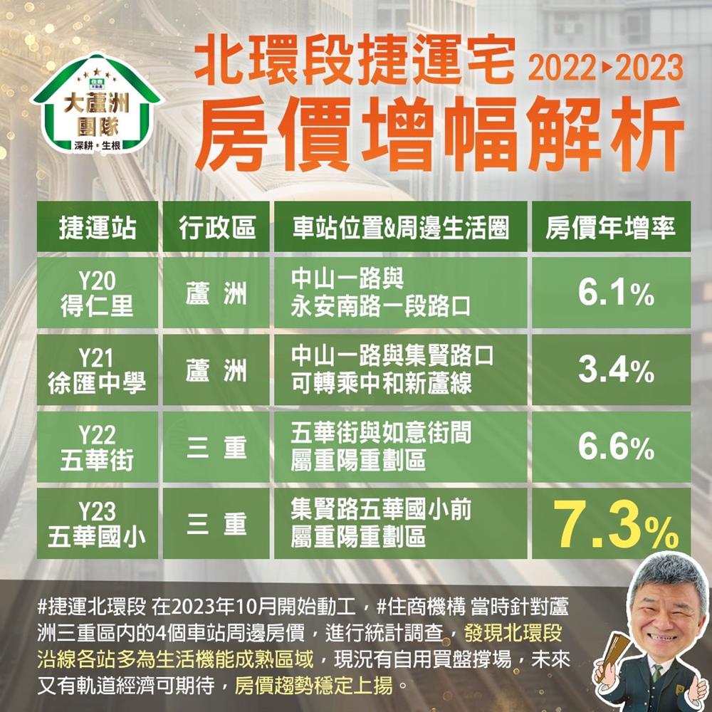 #捷運北環段 在2023年10月開始動工,#住商機構 當時針對蘆洲三重區內的4個車站周邊房價,進行統計調查,發現北環段沿線各站多為生活機能成熟區域,現況有自用買盤撐場,未來又有 #軌道經濟 可期待,房價趨勢穩定上揚📈