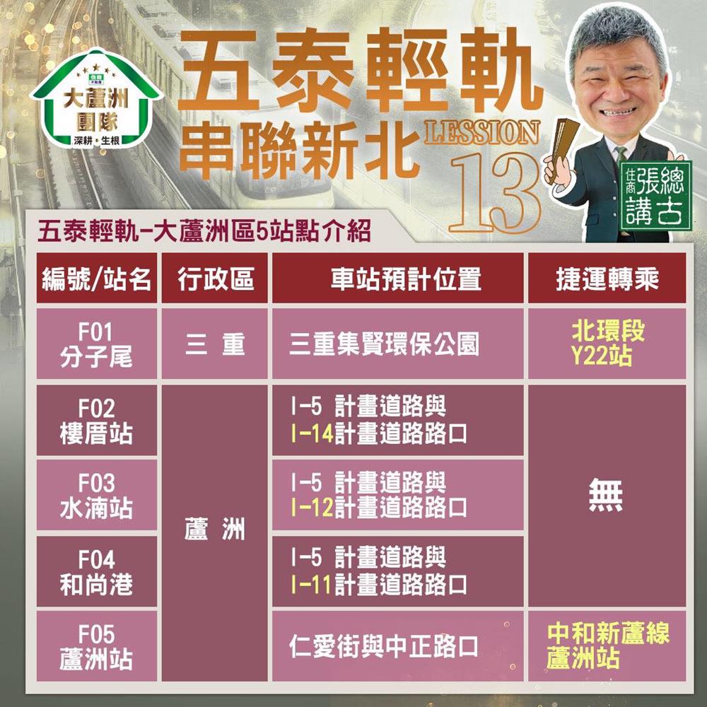 #五泰輕軌 將有5個平面式站點設在 #大蘆洲地區 ,目前站名還未正式定案,我們先將站點位置彙整提供圖表給大家參考⬇️