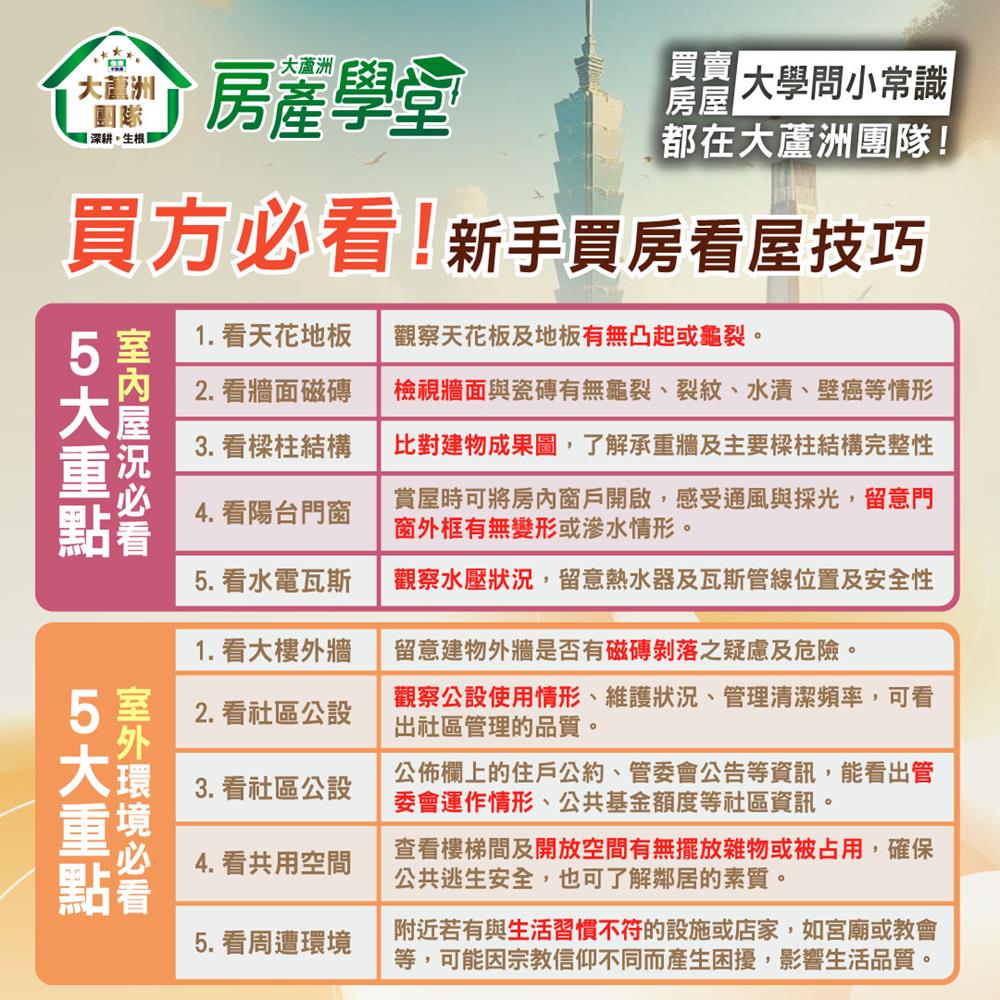 全台房市買氣強強滾!想要買房,#看屋技巧 是必修的功課,最專業的 #大蘆洲房產學堂 教您 #新手買房 的看屋技巧,從室內屋況到周邊環境的觀察要點一一幫您解析,助您實現 #幸福成家 的圓滿人生🫶