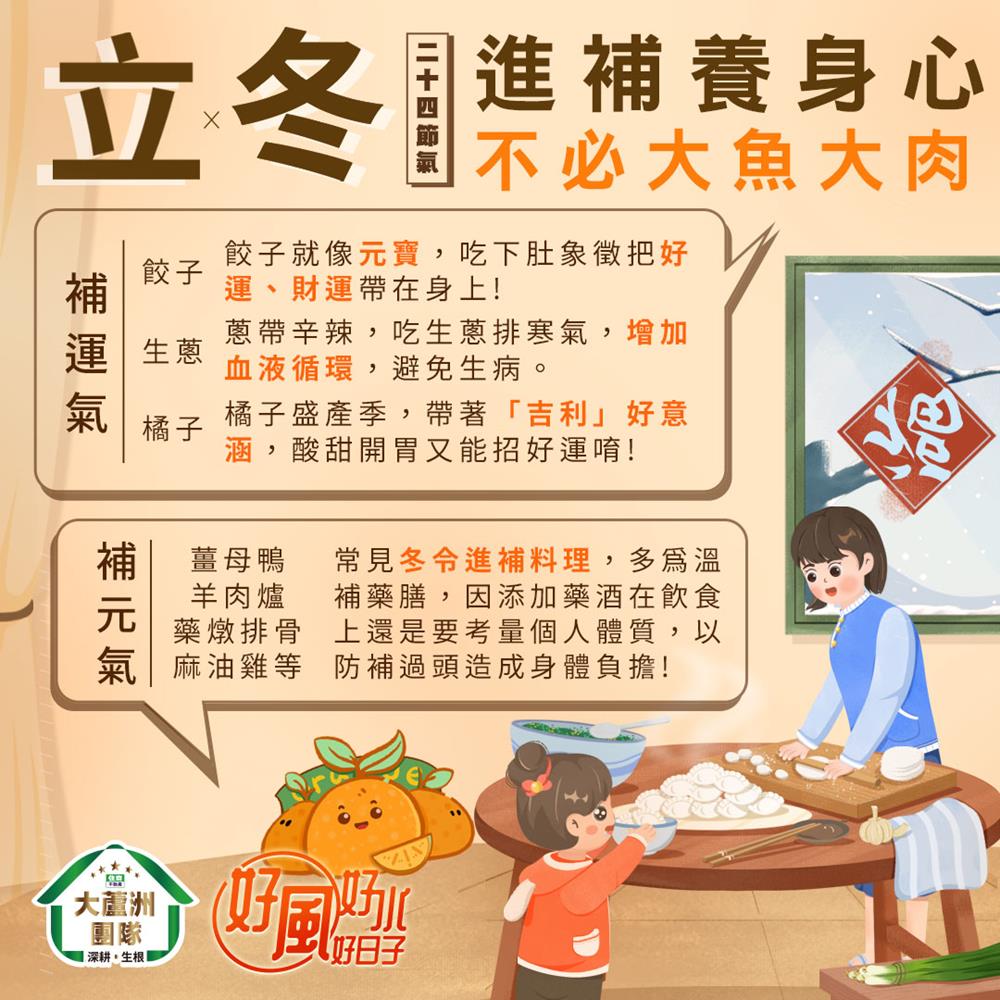 🚩「立冬」在24節氣中,是冬季的開端,今年立冬的日子是國曆的11月7日。對應古早農業社會,經過一年的農忙辛勞,「立冬」正是進入冬季農閒休息的階段,民眾也趁著此時養精蓄銳,補充元氣💪