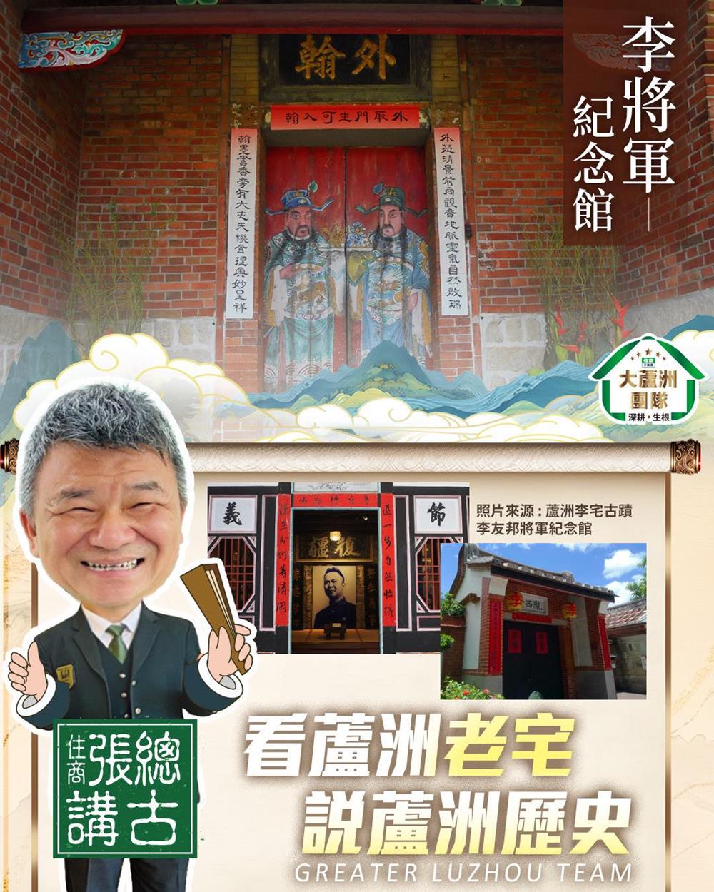 #李友邦將軍紀念館 整個園區占地1200多坪,有三進三落四護龍共計60間房,是台灣第一座列為古蹟的民宅,從民國74年被核定為三級古蹟,陸續修復至民國95年正式對外開放,現在這裡逢年過節有傳統節慶民俗展演、良辰吉時有新婚夫婦拍婚紗取景、每天有滿滿預約報名要收涎抓周的小baby、無時無刻都有學生來參訪、寫生、做學問…在這個兩百多年的古厝,不僅能看到過往蘆洲先祖們成家立功、開枝散葉的歷史風光,更能看到今時蘆洲年輕人薪火相傳、朝氣蓬勃、前途不可限量!