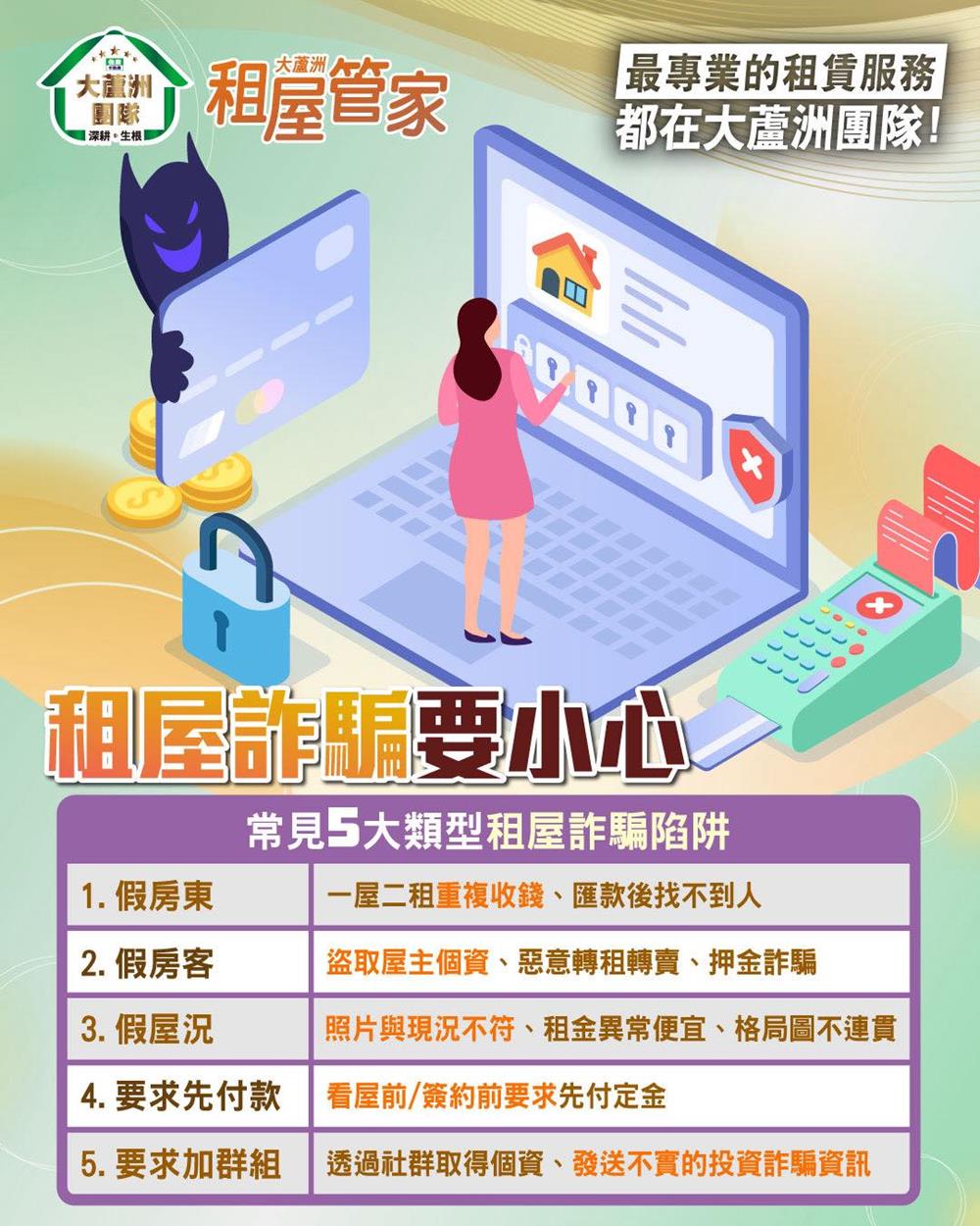 #大蘆洲租屋管家 提醒您,網路上的租屋廣告非常多,但圖文資訊虛實難辨,有些看起來物美價廉的房屋,很有可能「是詐騙或釣魚」,在未實地看屋前,切勿急著匯款,簽約之前也應詳閱合約條文內容,並查核對方身分及產權真偽。