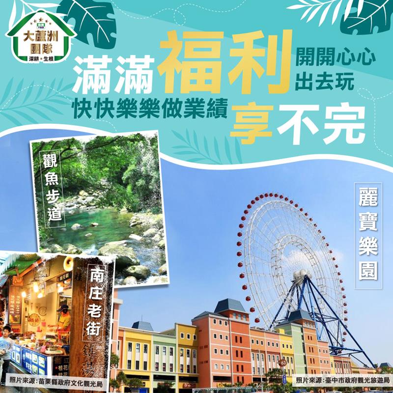 跟著 #大蘆洲團隊 吃香喝辣,帶著好夥伴水陸聯歡。#麗寶樂園、#星級飯店、#觀魚步道、#南庄老街,精彩豐富的行程,熱鬧非凡的聚會,#住商大蘆洲團隊 帶您認真工作用力玩🫰
