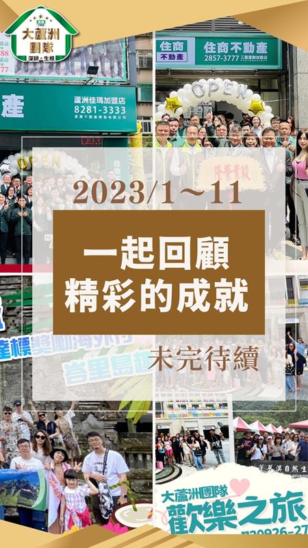 和 #住商大蘆洲團隊 一同回顧這精彩的2023年!在這段時間,我們不僅成功擴大業務,開設了兩間店面 #蘆洲佳瑪店 及 #三重重劃店 並發展了租賃業務 #兆基租屋蘆洲三民店,更取得了一系列令人矚目的成就。